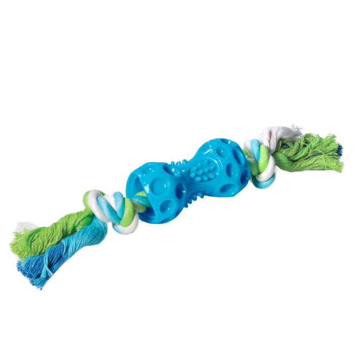 Фактурная игрушка для собак из термопластичной резины поможет поддержать в тонусе жевательные мышцы, укрепить и очистить зубы питомца. Термопластичная резина сохраняет упругость и эластичность даже при низких температурах и отличается длительным эксплуатационным периодом. Такой материал мало подвержен химическому или термическому воздействию, не токсичен, а также легко моется и не требуют особого ухода. А благодаря прочному веревочному основанию эта игрушка разнообразит досуг питомца и послужит в том числе функциональным аксессуаром для перетяжки. Цвет изделия: гантель - голубая, веревка - разноцветная. Размер изделия: 320*50*50мм.