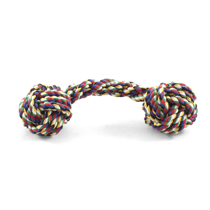 Гантель сделана из разноцветных веревок из натурального хлопка, очень прочная игрушка. Способствует тренировке жевательных мышц у собаки. Цвет: разноцветный. Размер d70*240мм.