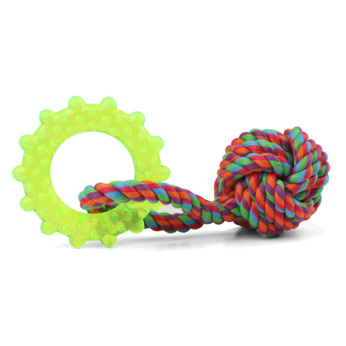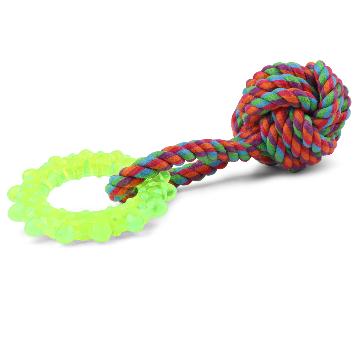 Игрушка с веревочным мячом и кольцом из термопластичной резины подойдёт для тяговых игр с собаками. Собаки обожают играть с веревочными игрушками, так как их можно грызть, трепать и носить в зубах. Такие игрушки отлично массируют десны и очищают зубной налет во время игры. Веревка сплетена из хлопковых нитей и безопасна для здоровья питомца. Цвет изделия: разноцветный. Вес изделия: 125г. Размер изделия: 200*80*70мм (кольцо - 80мм, мяч - 70мм).