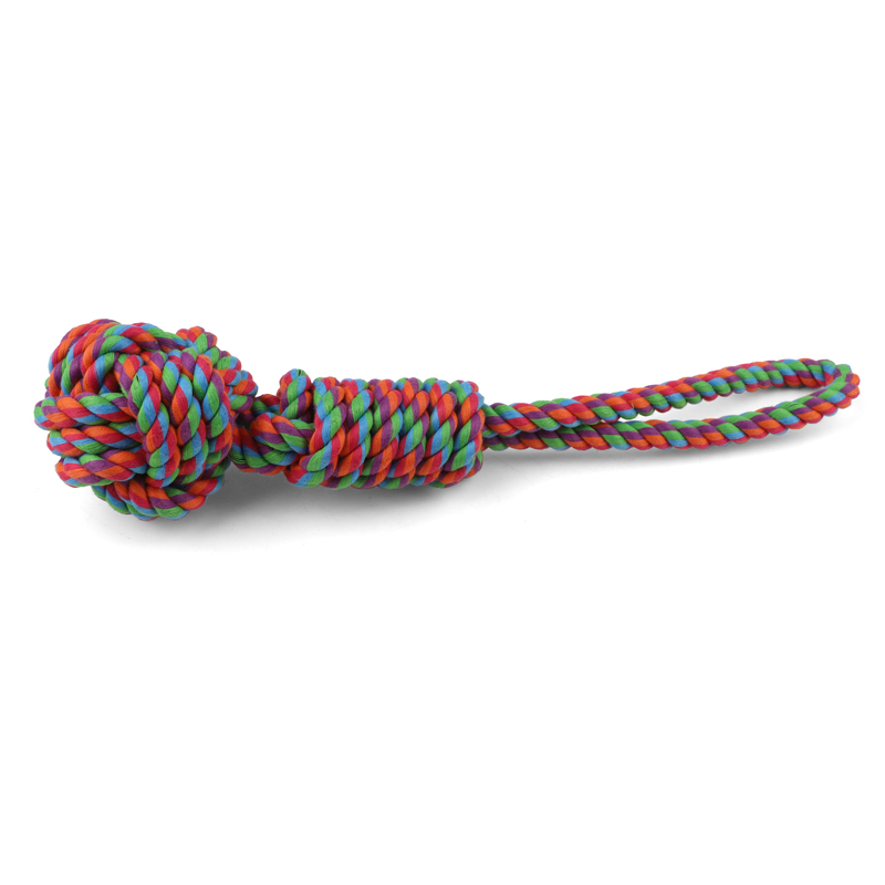 Веревка с плетёным мячом предназначена для тяговых игр с собаками. Собаки обожают играть с веревочными игрушками, так как их можно грызть, трепать и носить в зубах. Такие игрушки отлично массируют десны и очищают зубной налет во время игры. Веревка сплетена из хлопковых нитей и безопасна для здоровья питомца. Цвет изделия: разноцветный. Вес изделия: 160г. Размер изделия: 320*70*70мм (мяч - 70мм).