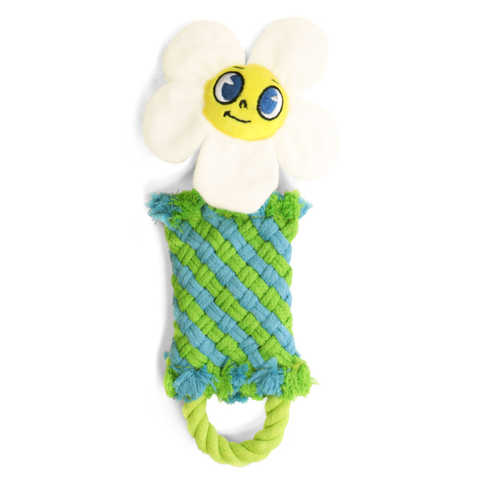 Забавная и функциональная игрушка в виде ромашки, выполненная из плетёных верёвок - это экологичное, прочное и безопасное развлечение для вашего питомца. Она отлично подходит для активных игр, массажа дёсен и чистки зубов. Шуршащие элементы в лепестках заинтересуют собаку любого возраста. Внутри игрушки находится звонкая "пищалка", которая пробуждает охотничьи инстинкты животного, делая игру еще интереснее. Цвет: бело-зеленый. Размер: 270*120*30мм.