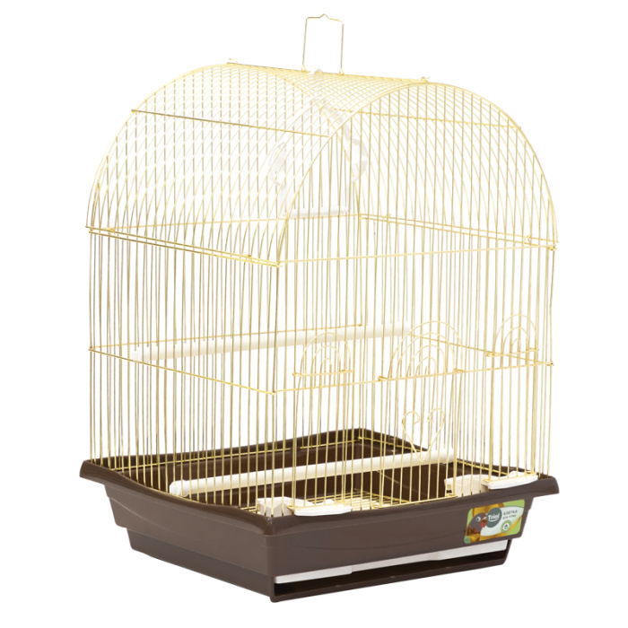 Клетка для птиц с полукруглой крышей - полезный аксессуар для владельцев пернатых питомцев небольшого размера. Прочная и удобная, такая клетка займет достойное место в любом интерьере, отвечая всем жизненным потребностям пернатых питомцев. В комплектацию изделия входят 2 кормушки-поилки, 2 жердочки и качели. Клетка также оборудована удобной ручкой для переноски и специальным пластиковым поддоном, облегчающим процесс уборки. Цвет: золотой/коричневый. Размер изделия: 350х280х460мм.