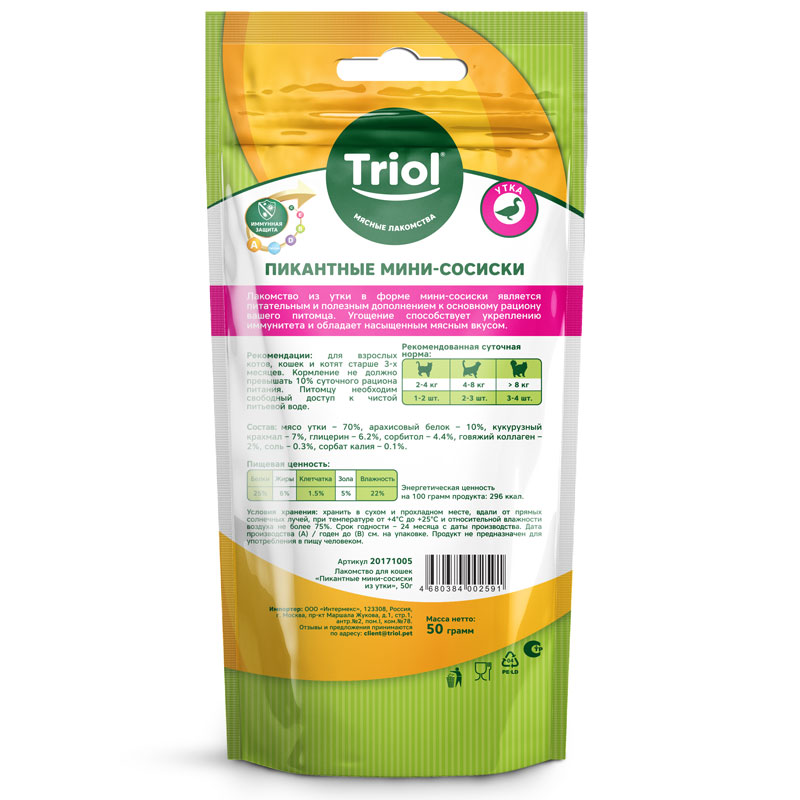 Пикантные мини-сосиски из утки – это полезное угощение для здоровья вашего питомца, обогащенное общеукрепляющим комплексом витаминов А, Е и D3. Вес нетто 50г.