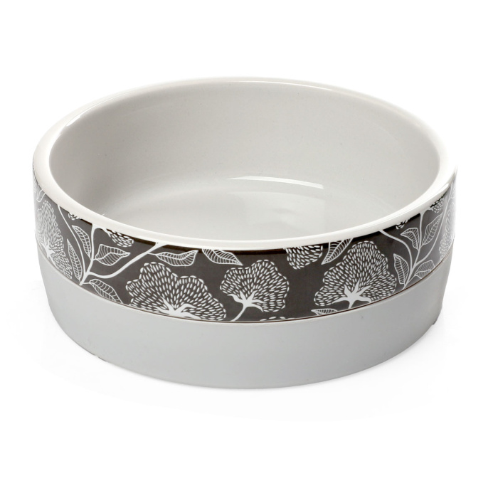 Стильная и функциональная миска для животных выполнена из высококачественной керамики яркой расцветки. Такая миска идеально подойдет как для воды, так и для корма любой консистенции. Она комфортна для питомца и легко моется под струей проточной воды с использованием бытовых моющих средств. Благодаря съёмной силиконовой накладке в нижней части изделие не гремит и очень устойчиво на любой поверхности. А оригинальный дизайн позволит такой миске стать украшением любого интерьера. Цвет изделия: серый. Размер изделия: d дна - 165мм; d дна керамической части - 160мм, d верхней части - 175мм; d верхней части с внутренней стороны - 160мм, высота - 65мм. Объем - 0,85л.