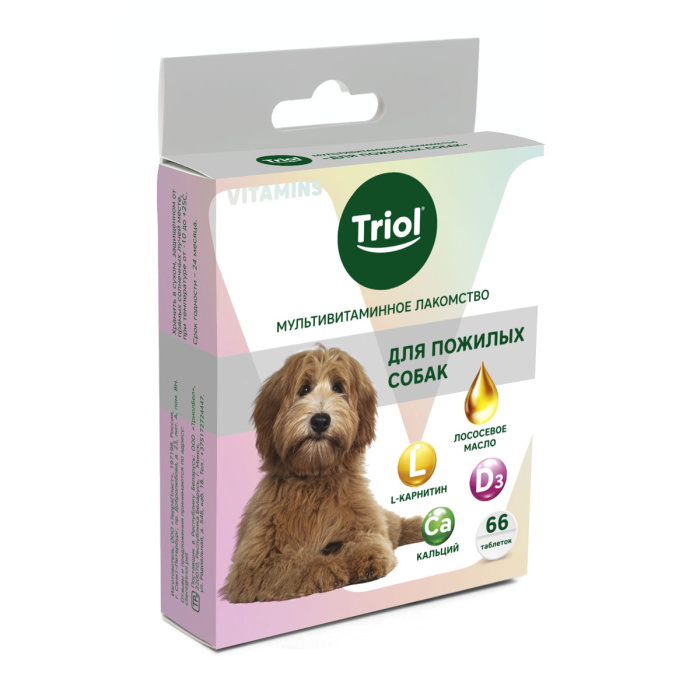 Мультивитаминное лакомство «Для пожилых собак» TRIOL – это источник полезных веществ, необходимых для поддержания иммунной системы и улучшения обмена веществ вашей собаки. Лососевое масло содержит незаменимые жирные кислоты омега-3, которые влияют на развитие мозга, иммунной системы и зрения. Омега-3 также поддерживает здоровье и красоту кожи и шерсти: увлажняет и защищает от негативных факторов окружающей среды. L-карнитин помогает организму поддержать мышечную массу и переработать жир в энергию. Он способствует поддержанию здорового веса и активно участвует в жировом обмене. Витамин D3 играет ключевую роль в усвоении кальция и фосфора – укрепляет зубы и опорно-двигательный аппарат. Активные компоненты лакомства влияют на общее развитие питомца: поддерживают иммунитет, заботятся о гибкости костей, суставов и связок.