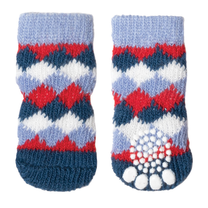 Домашние носочки с узором из ромбиков - не только стильный, но и полезный аксессуар для вашего питомца. Такие носочки ограждают интерьер от когтей любимца и, благодаря противоскользящему покрытию, позволяют четвероногому питомцу с комфортом передвигаться по паркету, кафелю и другим скользким покрытиям. Теплые, легкие и функциональные, эти носочки также отлично подойдут для согревания лапок питомца в зимний период, если их одеть под ботинки. Цвет: красно-розовый, сине-красный.