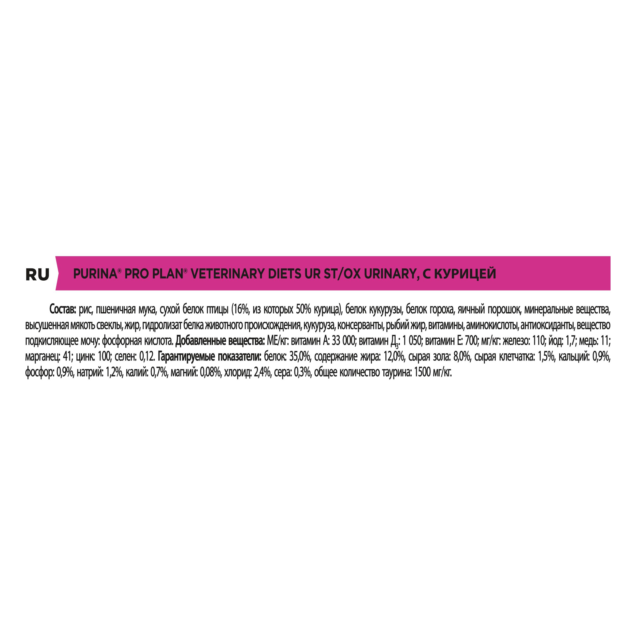 Корм сухой полнорационный диетический PRO PLAN® Veterinary Diets UR St/Ox Urinary (Уринари) для взрослых кошек при болезни нижних отделов мочевыводящих путей, с курицей. Корм рекомендуется для растворения струвитных камней и снижения вероятности их повторного образования, со свойствами подкисления мочи и низким содержанием магния. Продукт разработан также для диетотерапии кошек с заболеваниями нижних отделов мочевыводящих путей. Использование данного корма рекомендовано под наблюдением ветеринарного врача.