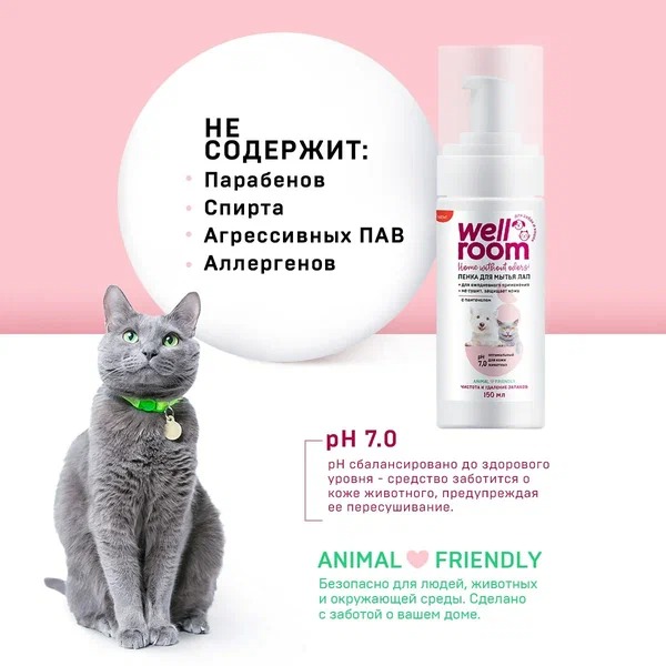 Пенка для мытья лап с пантенолом Wellroom разработана для ежедневной эффективной очистки лап питомца после прогулки.
