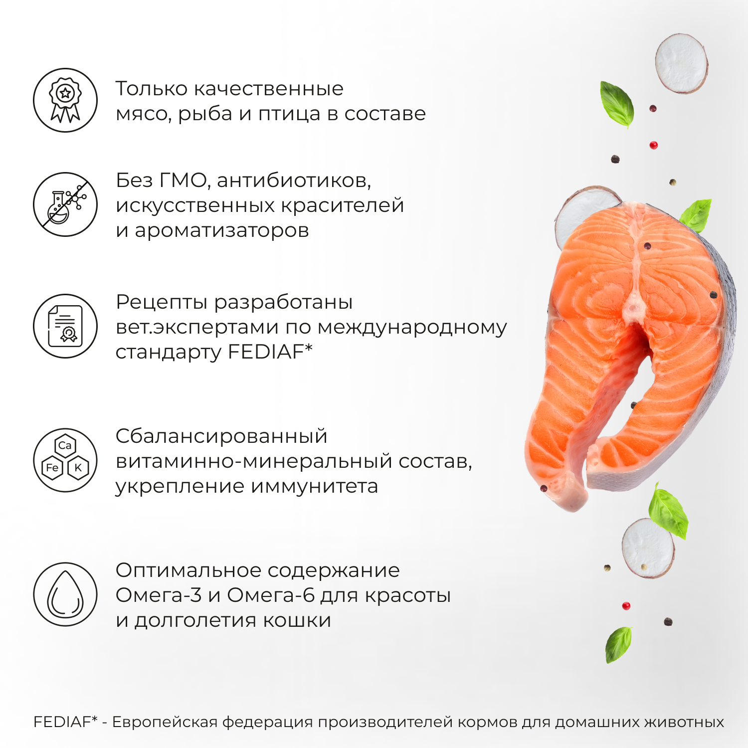 - Натуральные мясные ингредиенты и лосось