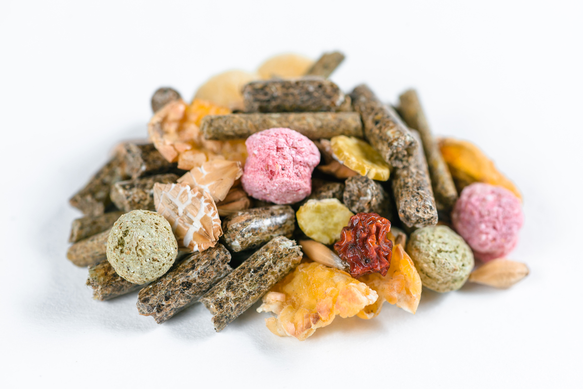 гранулы, содержащие травяную муку, семена злаковых культур, сухие овощи, ягоды шиповника, витаминно-минеральный комплекс; пшеница, хлопья ячменные, хлопья кукурузные, ячмень, горох плющеный, овес, морковь, плоды рожкового дерева, ягоды.