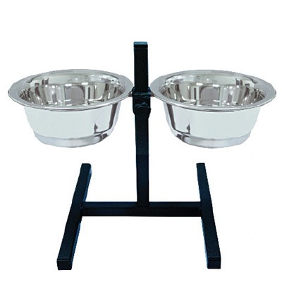 Подставка квадратная с двумя металлическими мисками из нержавеющей стали. Объём каждой миски 0,9 л. Подставка регулируется по росту питомца, высота варьируется от 10 до 30 см. Возможность регулирования высоты мисок содействует правильному развитию скелета и осанки питомца. Подставка очень устойчивая, а ножки на резинках препятствуют скольжению по поверхности пола. Покрытие мисок и самой подставки обладает стойкостью к внешнему воздействию и безвредно для здоровья любимца.
