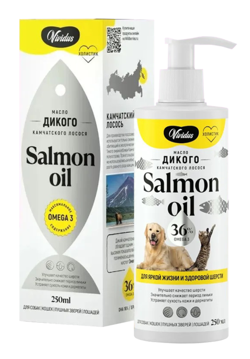 Благодаря высокому содержанию OMEGA-3 -лососевое масло эффективно стимулирует рост красивой и блестящей шерсти с густым подшерстком, помогает быстрее восстановится после линьки